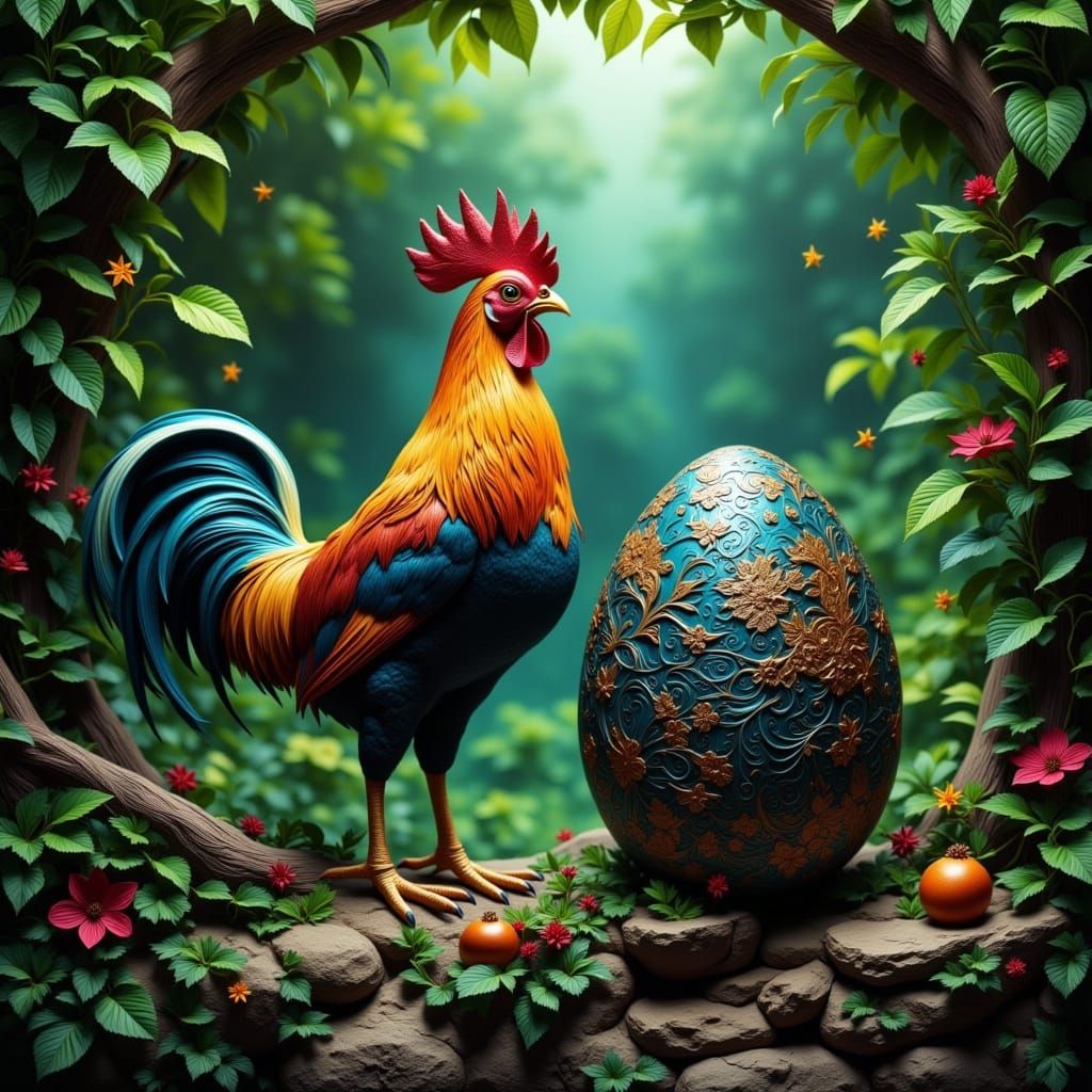 This enchanting image depicts a vibrant, dreamlike garden filled with lush greenery and colorful blooms, where a resplendent, shimmering chicken stands proudly beside a beautifully ornamented egg, evoking a sense of mystique and wonder.