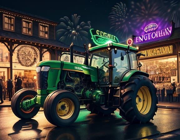 A stunningly detailed portrait of a great tractor on a village street adorned with neon lights for New Year's. Features pop art style with splash colors.
