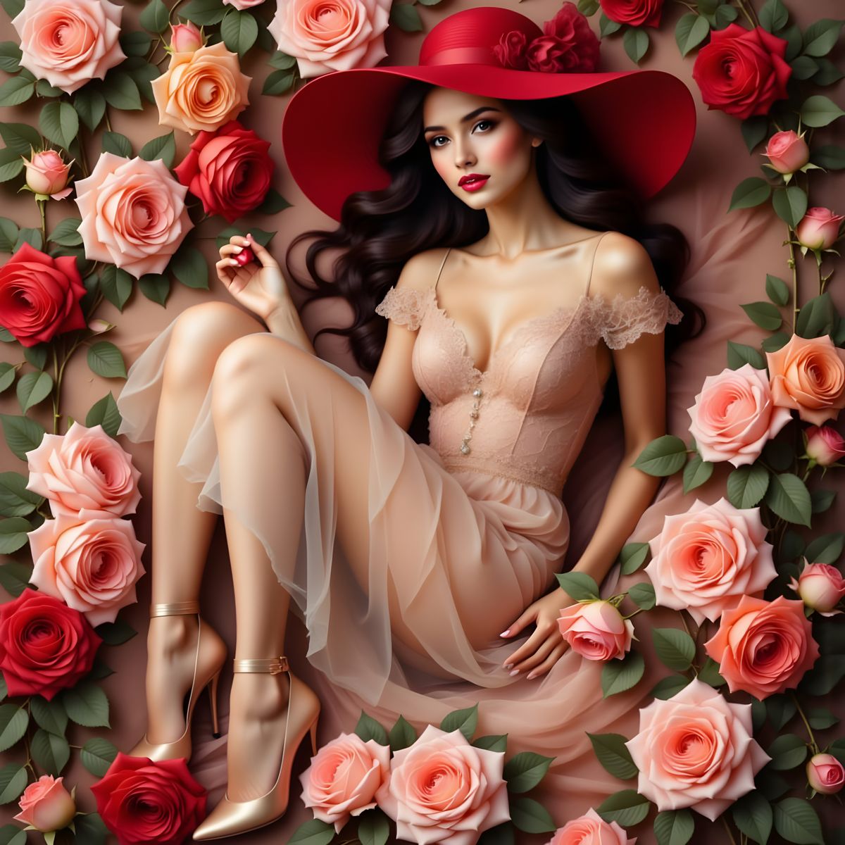 A striking picture of an elegant lady reclining among roses. This digital artwork features photorealistic rendering, vibrant colors, and dramatic Rembrandt-style lighting reminiscent of old Hollywood glamor.