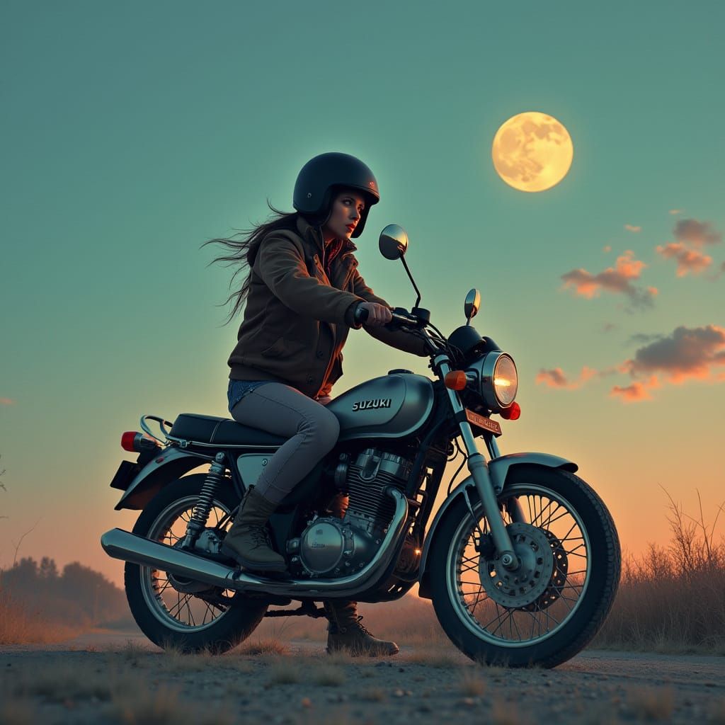 This image shows a woman with a helmet and leather clothing riding a black Suzuki GN125 motorcycle under a warm, golden sunset with a full moon. The image is reminiscent of photorealistic digital art.