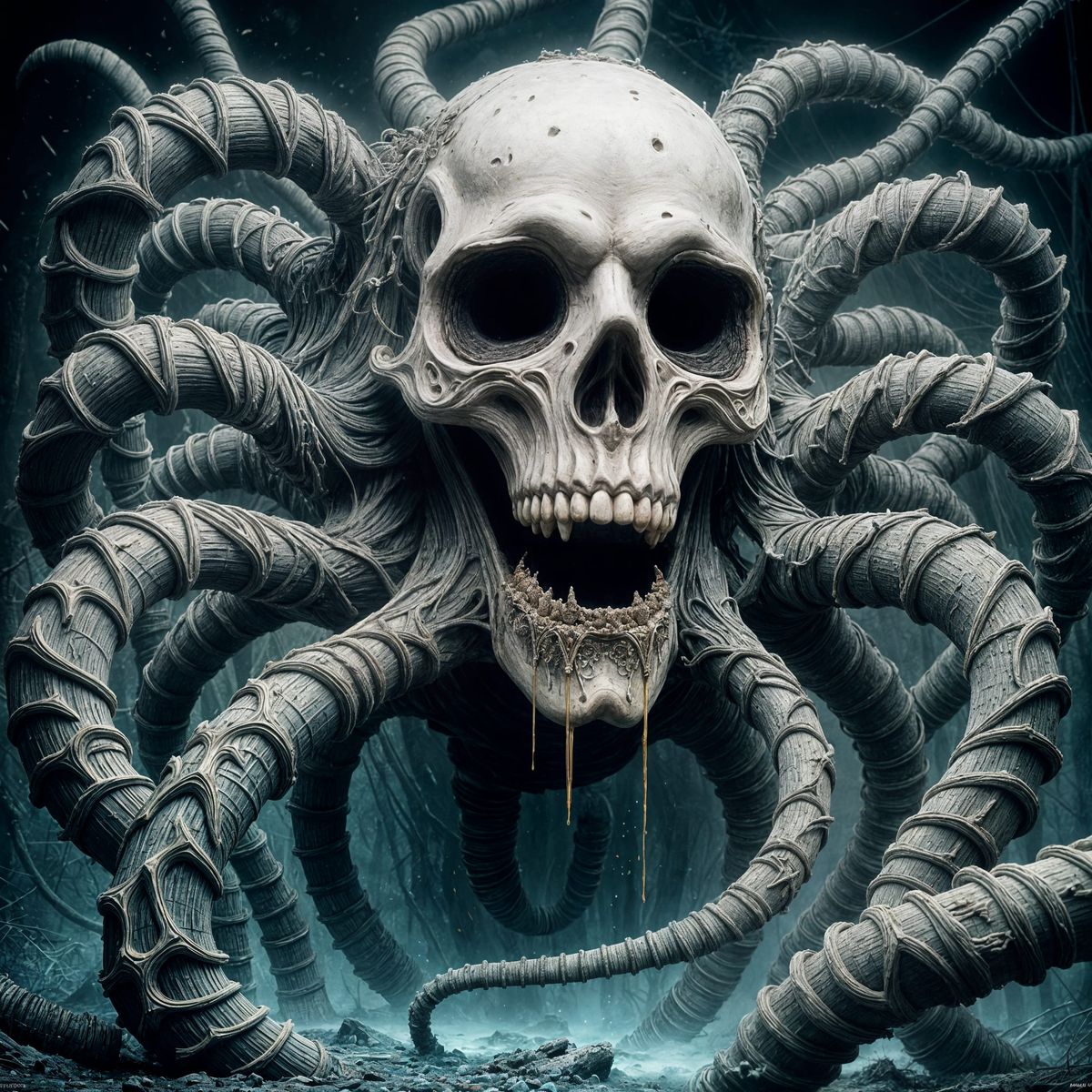 This haunting image depicts a grotesque, skeletal creature surrounded by glowing, tentacled sea creatures, evoking a sense of cosmic dread and existential horror, as if risen from the depths of the ocean, in a style reminiscent of dark, eerie atmospheres and supernatural landscapes.