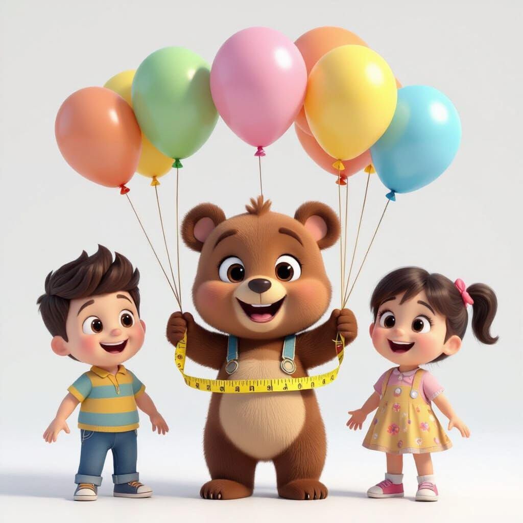 This image shows an adorable 3D cartoon of a baby brown bear holding vibrant balloons. The cheerful scene features a measuring tape ribbon and evokes a playful, childlike aesthetic in a Pixar style.