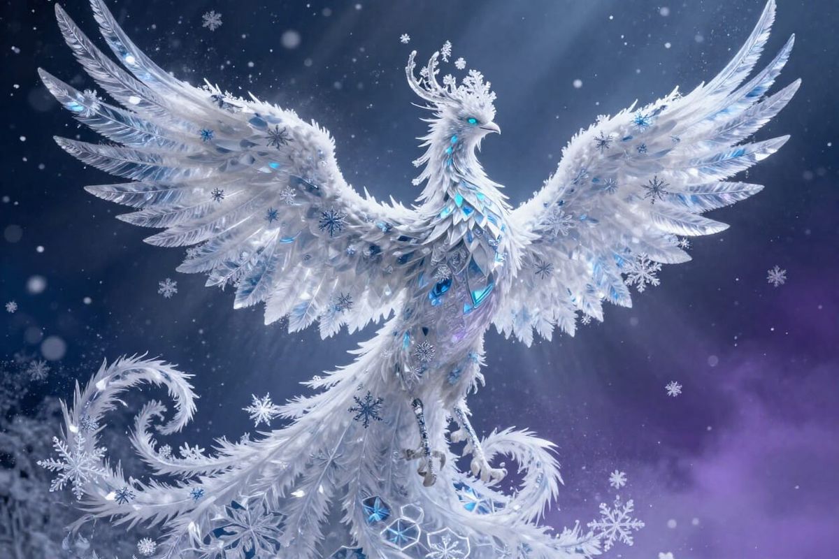 A majestic winter phoenix crafted entirely from intricate crystalline snowflakes, rising from a swirling snow vortex against a twilight gradient. God rays illuminate its icy blue wings and fractal details.