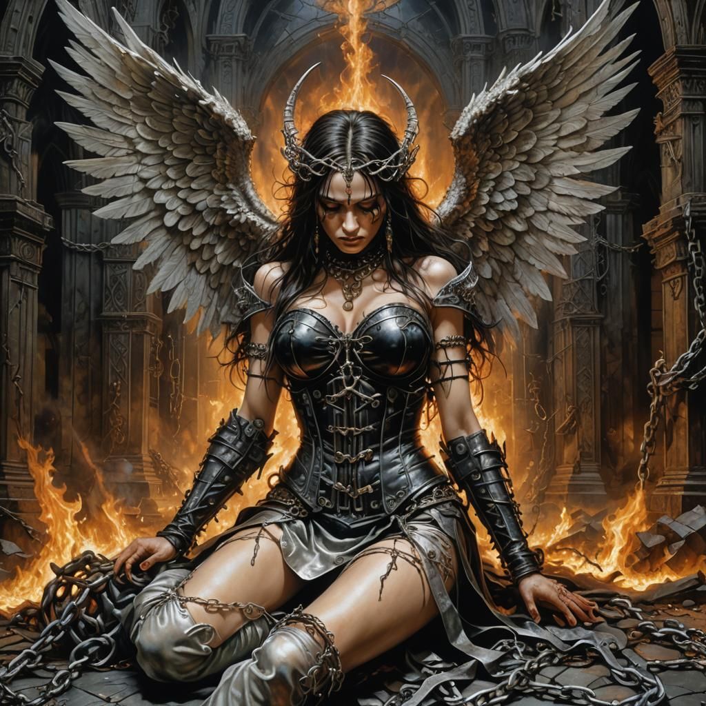 A dramatic image of a chained, tormented angel crawling through a hellish cathedral. The scene is illuminated by fire, rendered with photorealistic detail in a dark fantasy style.