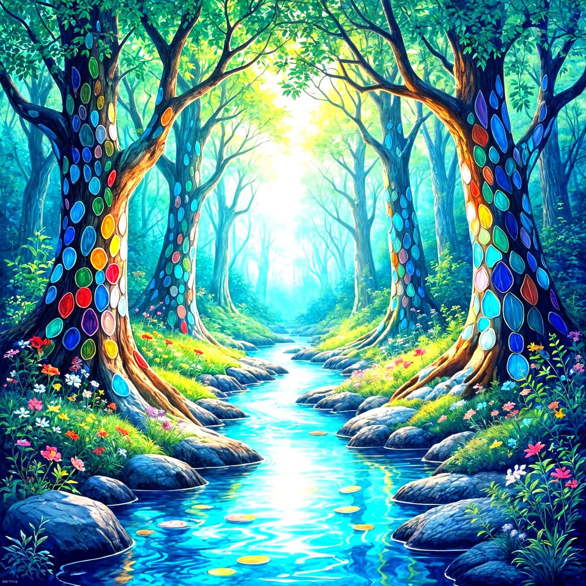 This image showcases a magical forest with trees crafted from colorful sea glass. A clear stream reflects the vibrant, fantasy-inspired illustration.