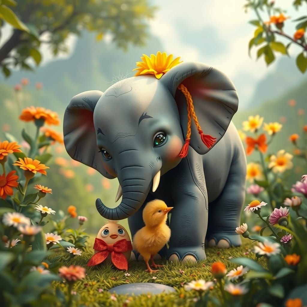 This image shows an adorable elephant gently petting a tiny chick amidst a colorful fantasy landscape. The scene is a detailed matte painting with rich, deep colors and lush flora, reminiscent of fantasy concept art.