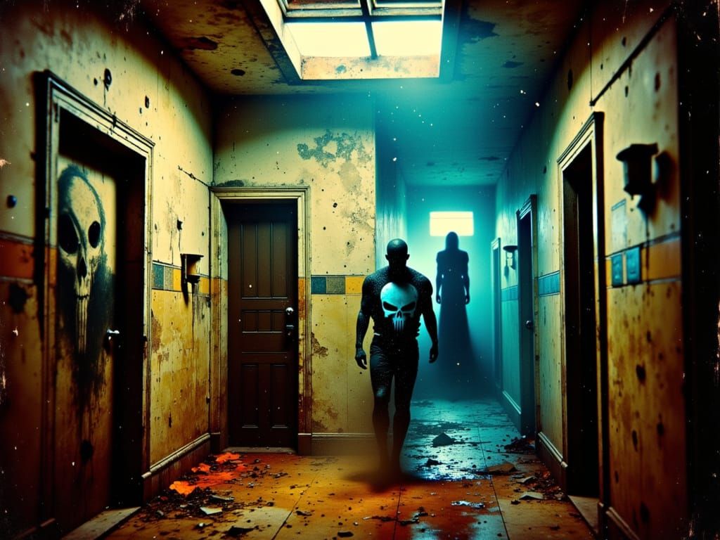 This image features a dynamic, full-body silhouette of the Punisher, created with a double exposure technique. Vibrant neon blues and golden-browns create deep contrast in a gritty cell setting.