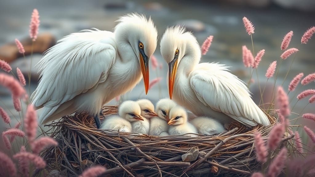A photorealistic digital painting of a heron couple caring for sleeping chicks by a spring river, rendered in soft, silvered tones with delicate details and dramatic lighting.