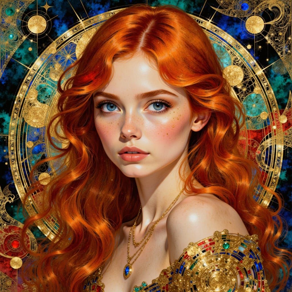 A fire-haired muse rises amidst golden and azure constellations, weaving the radiance of the earth with the mysteries of the cosmos..... Une muse aux cheveux de feu s'élève parmi les constellations d'or et d'azur, unissant l'éclat de la terre aux mystères du cosmos....