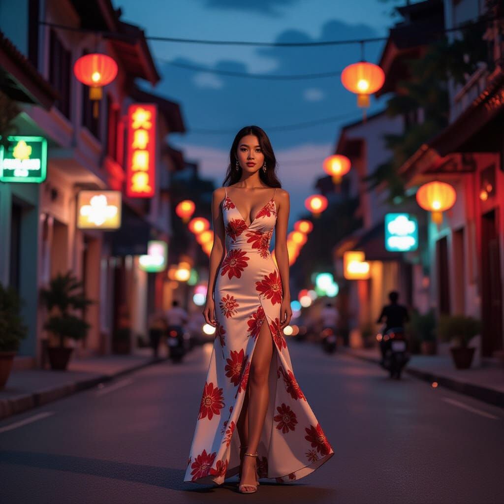 A Vietnamese woman in a contemporary dress with traditional motifs stands on a bustling Ho Chi Minh City street at dusk. Neon lights and lanterns create a warm glow, captured in a hyperrealistic digital painting style.