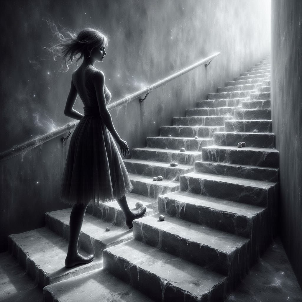 This image depicts a woman thoughtfully descending a deep staircase rendered in a stark monochrome palette with metallic sheen. Textures blend smooth marble with rough stone and icy elements.