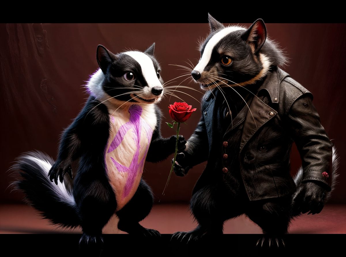 This image shows a lovelorn skunk's heartbreak. Thinking he's found a mate, he approaches with a rose, only to discover a rival. The scene is rendered with vibrant colors and dramatic lighting.