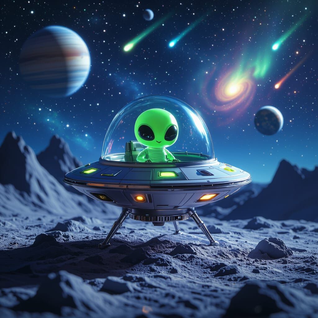 This image shows a miniature alien spaceship on the moon, featuring a cute neon green alien inside. The backdrop is a starry night sky with planets and vibrant nebulas, rendered as digital artwork.