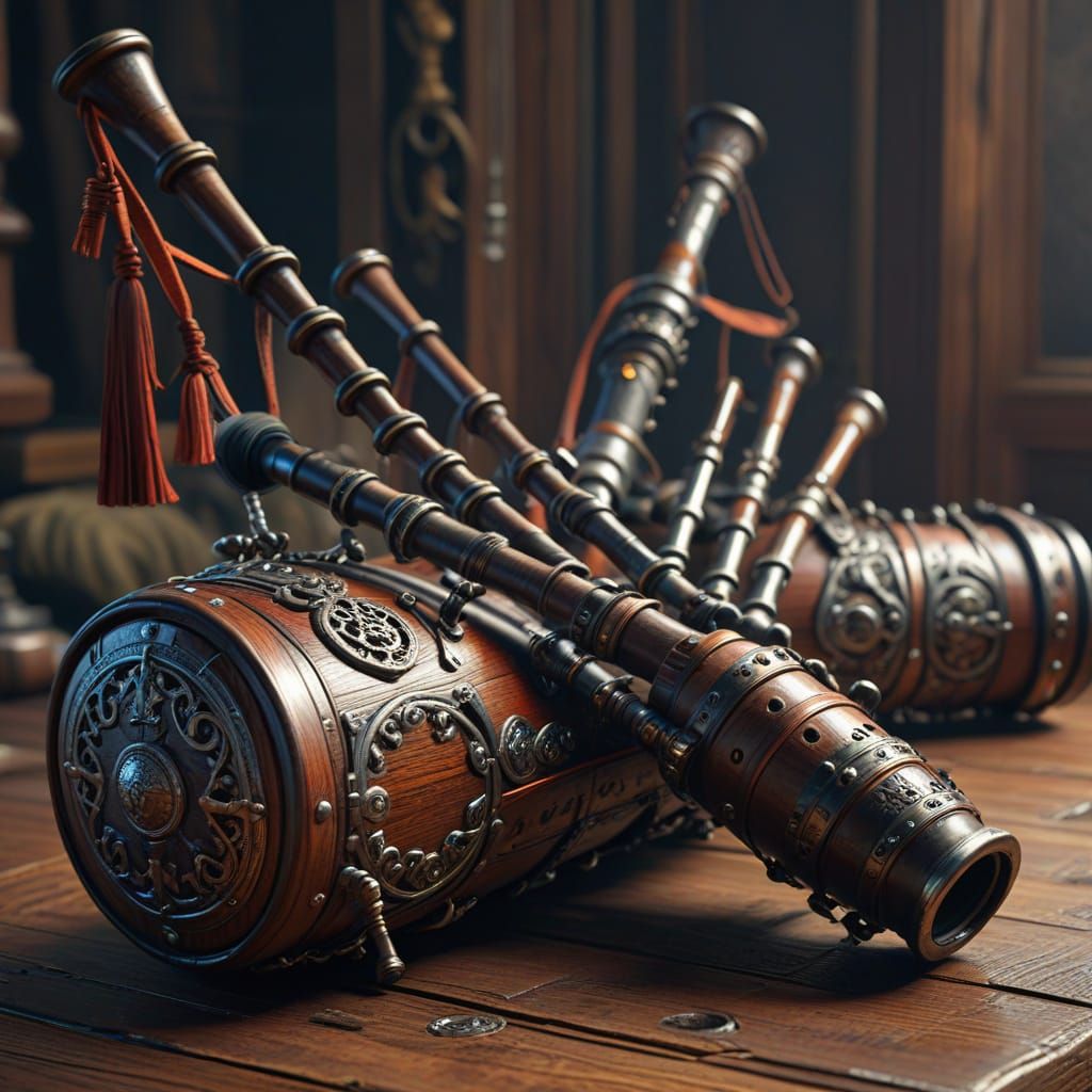 This highly detailed digital painting showcases intricate bagpipes with ornate metalwork and worn leather textures resting on polished wood. Features deep shadows and vibrant colors.