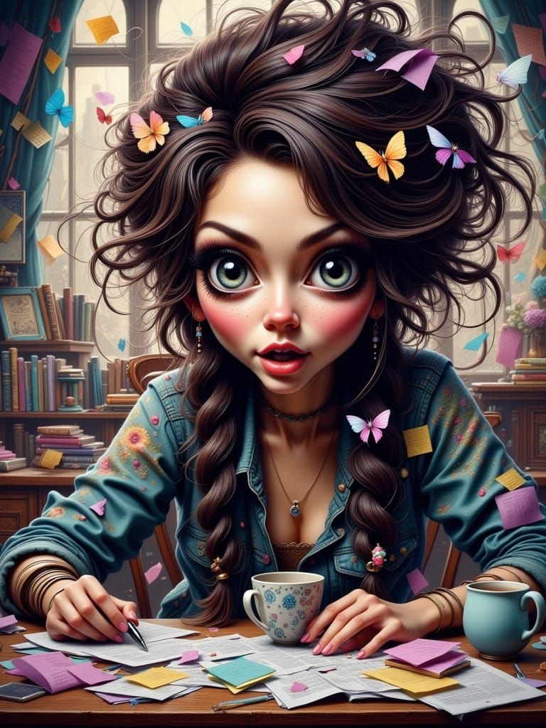 This image shows a woman in a messy home office reacting to a mischievous kitten. Features a colorful, comic-style splash art aesthetic with vibrant textures.