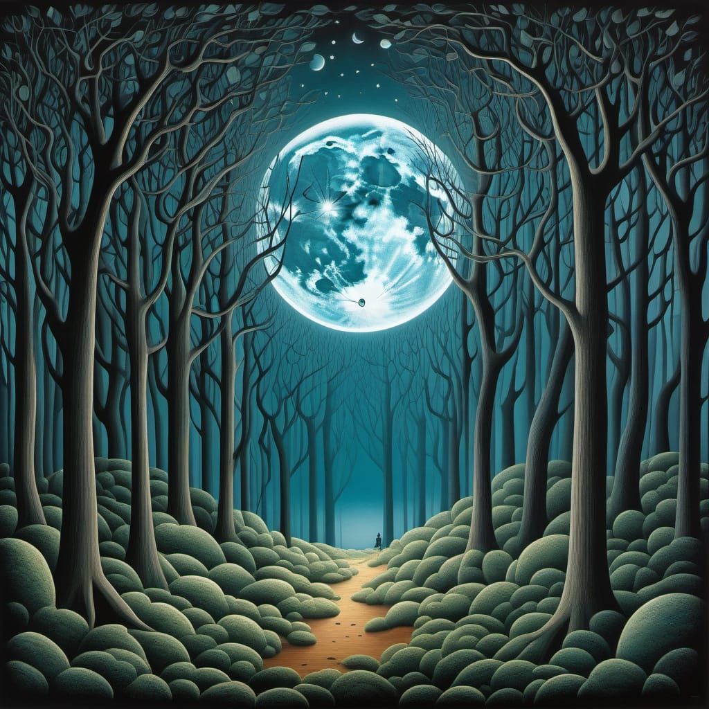 This image depicts a fantastical, moonlit forest with a surreal and dreamlike atmosphere, inspired by the symbolic art of Rene Magritte.