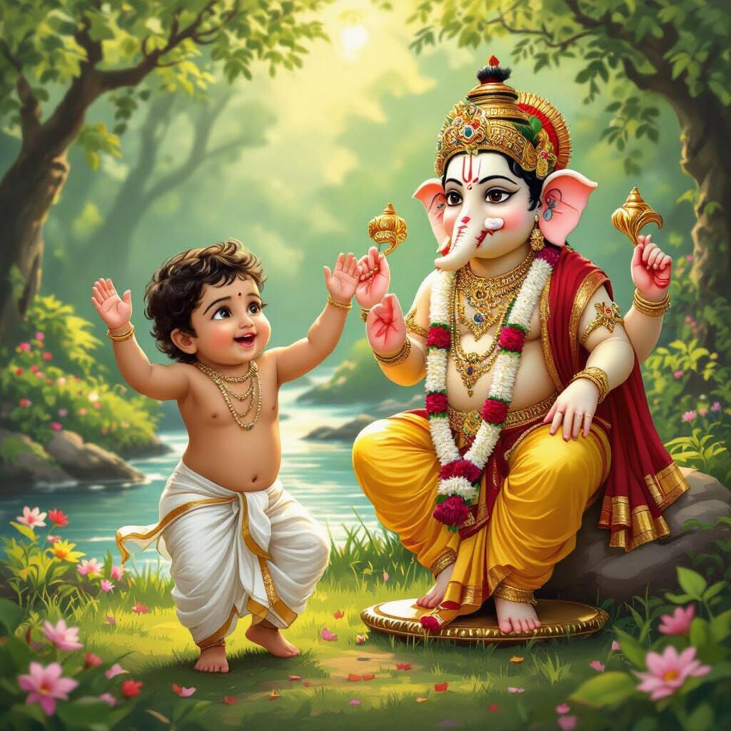 A vibrant image showing a chubby baby boy in traditional Indian clothing dancing next to Lord Ganpati. The scene is set in a mystical forest with soft golden light, reminiscent of classical Indian art.