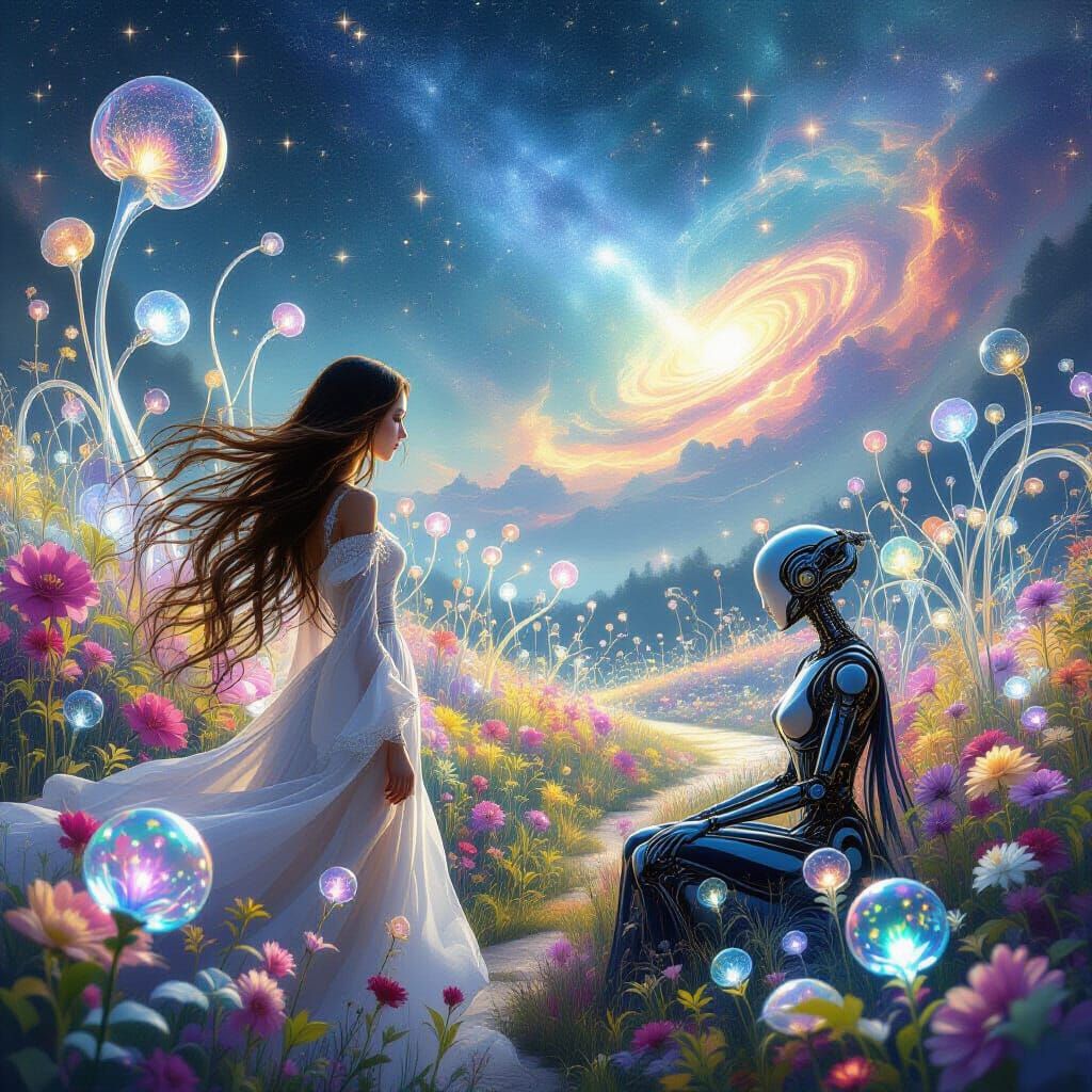This image depicts a woman with flowing hair in an alien garden of glass plants and light, attended by a female automaton. The scene features a starry nebula background and magical realism style.