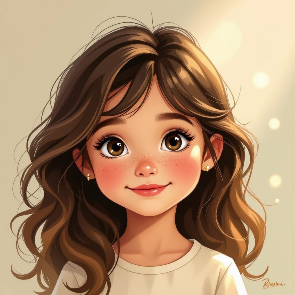 This image shows a curious 11-year-old girl with brown eyes and freckles, depicted in a whimsical storybook illustration style with soft, warm colors and visible brushstrokes. Gentle sunlight illuminates her face.