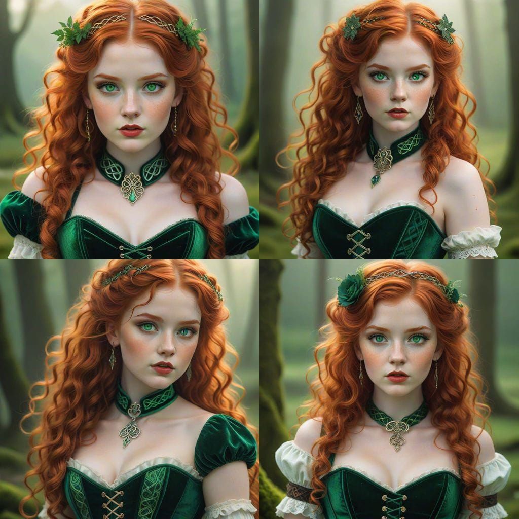 A stunning portrait of a fiery Celtic goddess with flame red hair, mossy green eyes, and a delicate emerald green velvet corset, set against a warm and vibrant background, exuding confidence and determination.