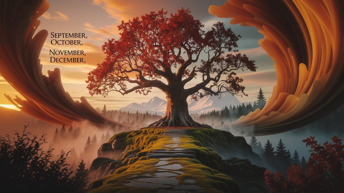 This image shows a solitary oak tree in a forest, symbolizing the transition between autumn and winter. The backdrop features Gothic and Celtic elements, with warm light filtering through amber mist, rendered as 3D digital art.
