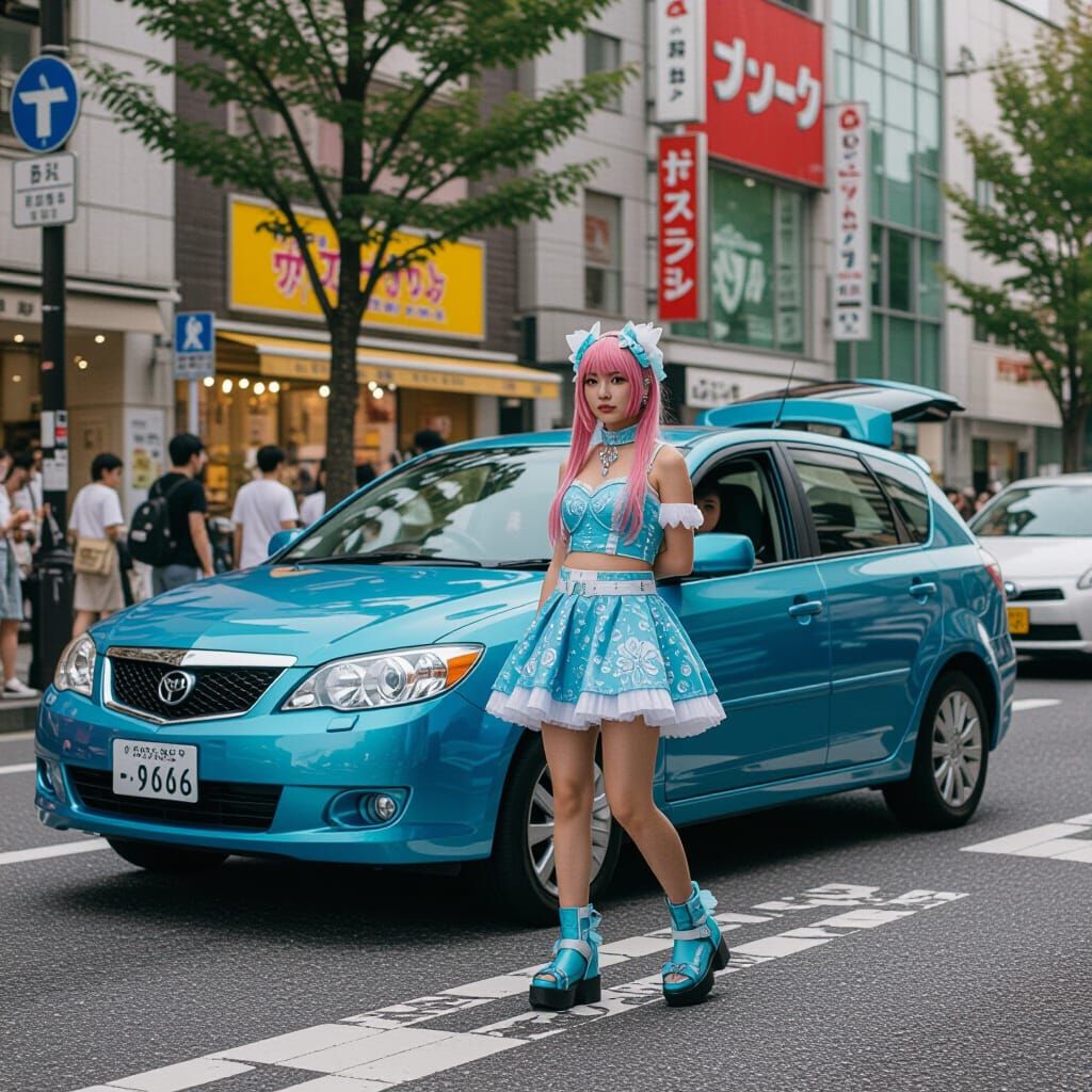 This image shows a Harajuku-style girl standing next to a blue Aztek car. The image captures the essence of Tokyo street fashion in a vibrant setting.