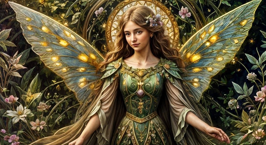 This hyper-realistic image features a smiling brown fairy with pretty eyes and hair, set against a mystical, holographic garden with floral borders and gold leaf mosaic details. Rendered with vibrant jewel tones.