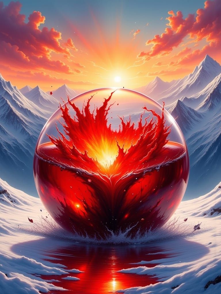 Sunset <lora:CRIMSON CROWN:1.0>over mountains<lora:Redlit Flux:1.0>. Snow Crimson Tempest ink<lora:Red Flux:1.0> maelstrom in bursting bubble<lora:2112:1.0>, water ink, ink water, loose painting style) floating in the air by double exposure
