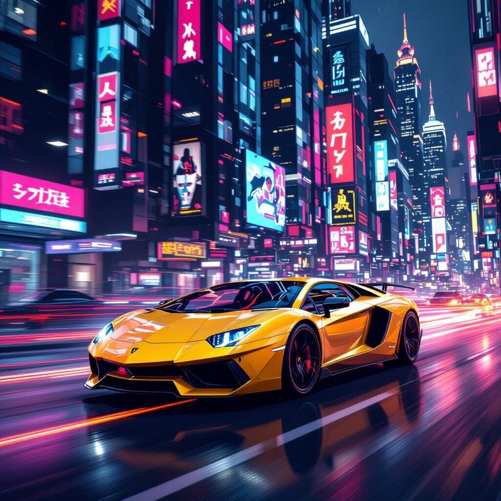A golden Lamborghini Aventador speeds down Broadway, framed by neon skyscrapers. The image features futuristic streaks of light in a matte-painted style with rich colors, creating a high-tech atmosphere.