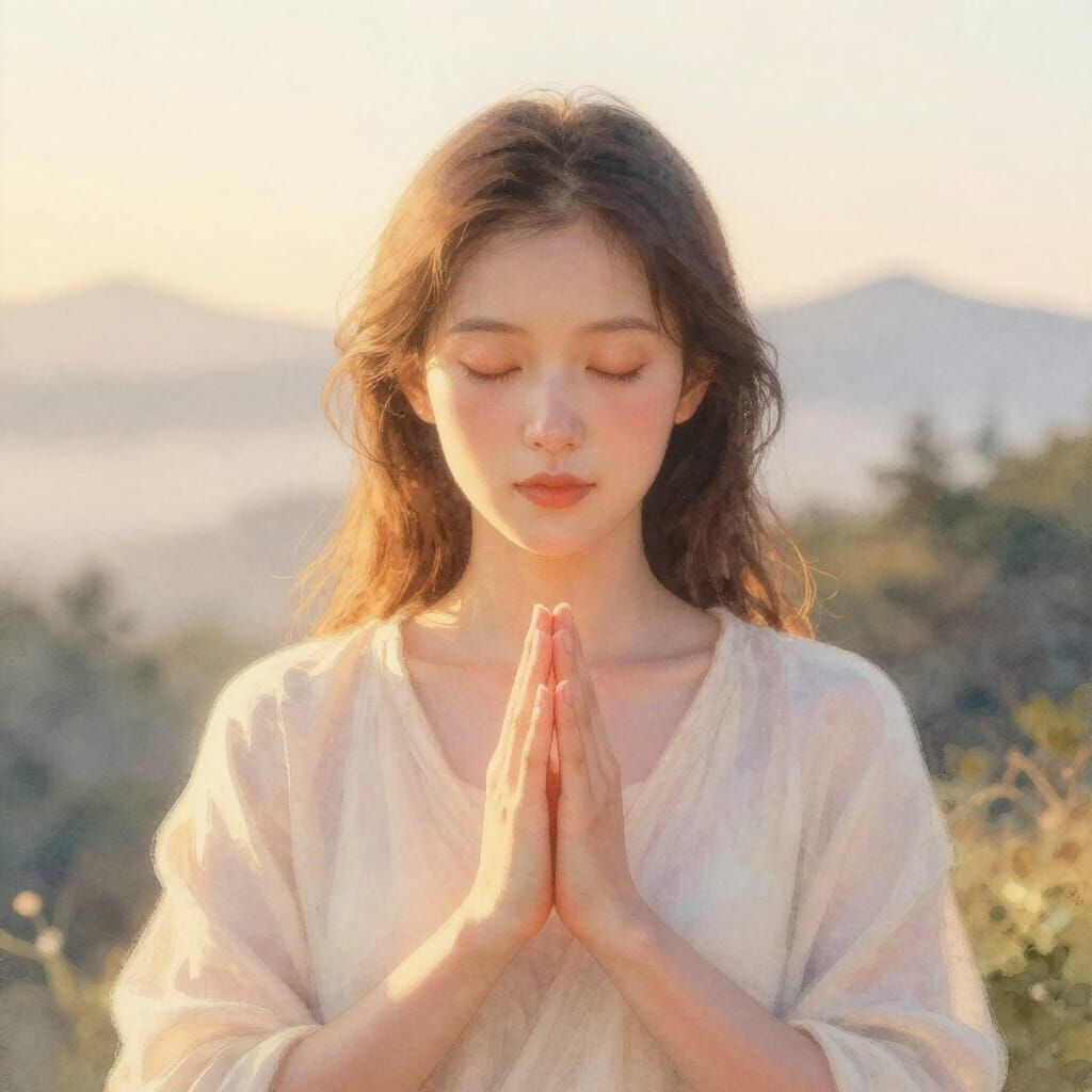 This image shows a woman in a peaceful Namaste gesture at sunrise, depicted in a soft pastel watercolor style with delicate brushstrokes and subtle color blending.