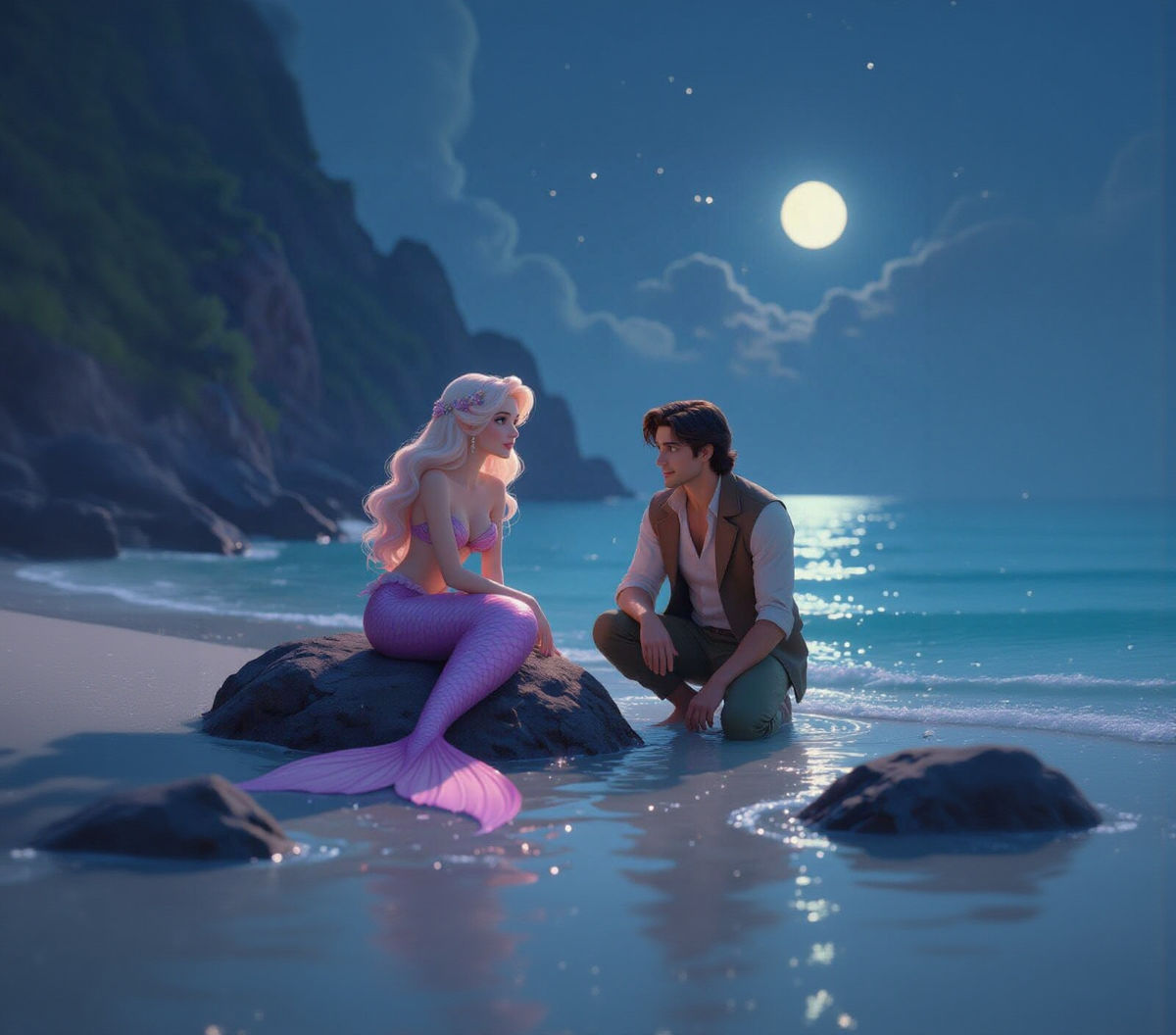 A fair-skinned mermaid with a pink-violet tail rests on a rock in a moonlit cove at dawn. A man kneels on the shore, both sharing warm expressions. Subtle sparkles dot the water.