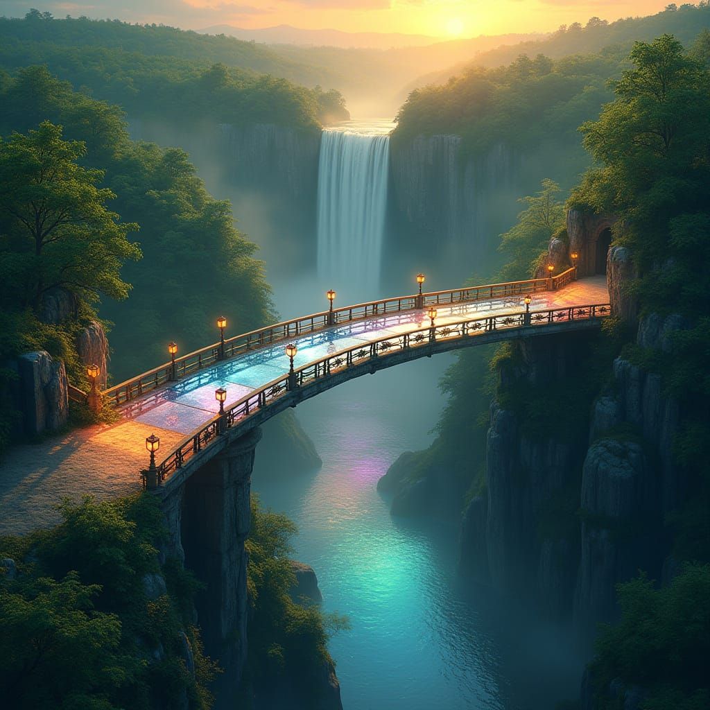 This image shows a breathtaking aerial view of a lush forest with a majestic bridge blending into the surroundings. The bridge features glass and LED floors, lanterns, and a waterfall in the distance, all set against a warm golden sunset.