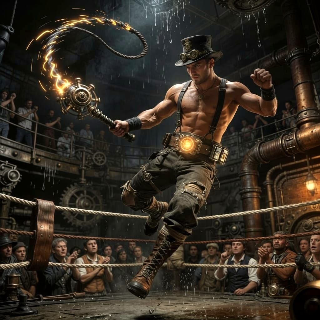 This image depicts a muscular steampunk boxer in a dark, sweaty fighting pit, spinning mid-air with a pulsing whip-flail weapon, ready for combat.