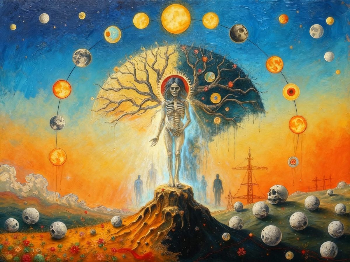 This image depicts the cycle of soul life and death in a surrealist style. Rendered as an impasto oil painting, it explores profound themes with textured brushwork.