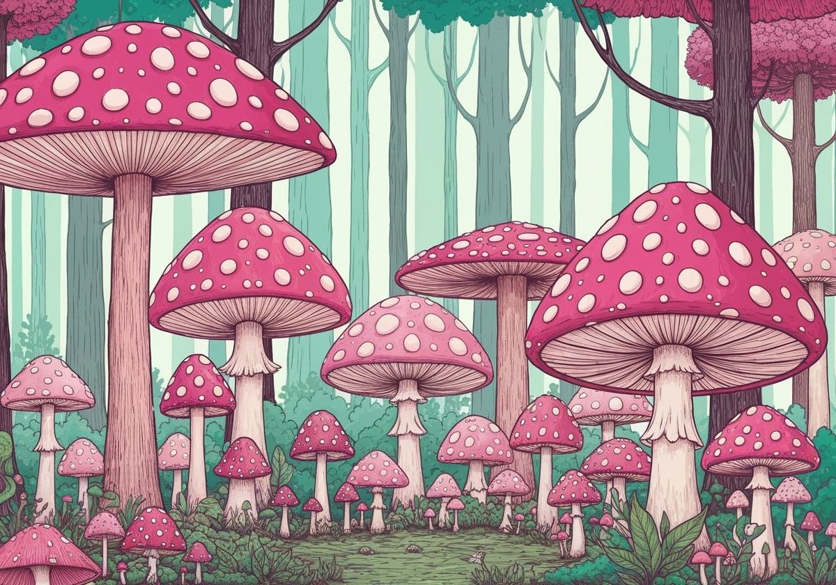 This detailed illustration showcases a fantastical forest with oversized mushrooms in shades of pink and white dots, featuring intricate textures.