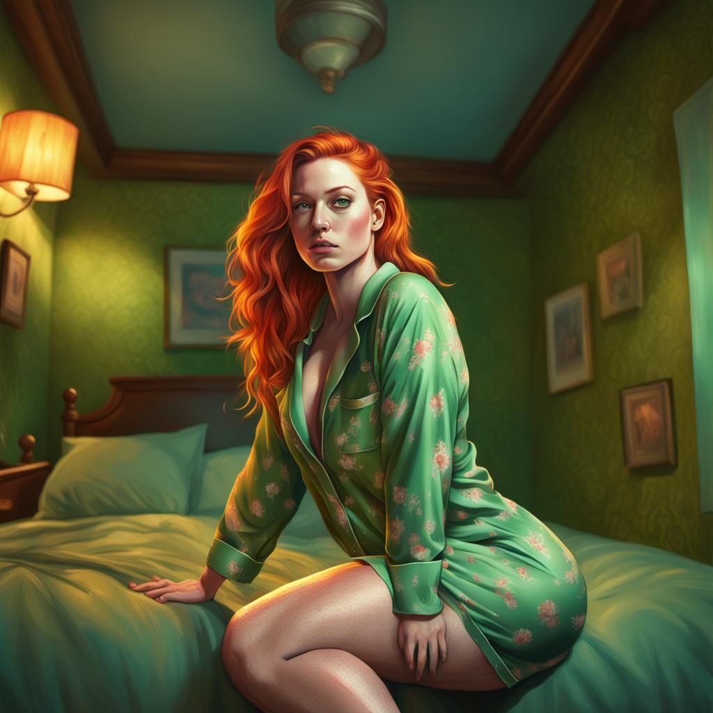 This image shows a hyperrealistic portrait of a red-haired woman with long legs, wearing green pajamas. The portrait is a splash art style concept, with intricate detail and a colorful background.