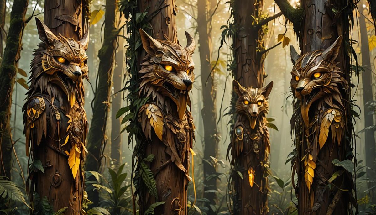 This image features intricately detailed wooden totem poles in a lush jungle setting, with hyper-realistic animal heads that seem to transform into ethereal smoke. The scene is bathed in warm, earthy tones and cinematic lighting, evoking a sense of drama and mysticism.