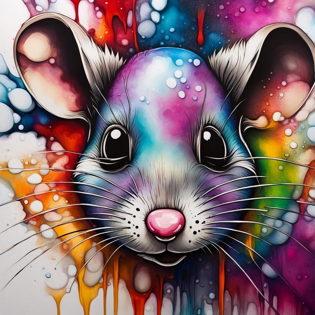 This image shows a vibrant close-up of a mouse face rendered in graffiti art style. The artwork features a splash art aesthetic with melting oil gouache effects and high contrast.