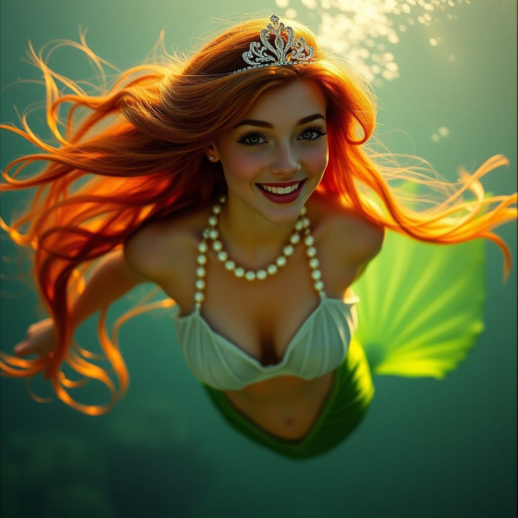 A digital artwork of a mermaid princess with long reddish-brown hair, wearing a shell top and tiara. The cinematic image showcases her swimming underwater with a vibrant green tail and warm golden lighting.
