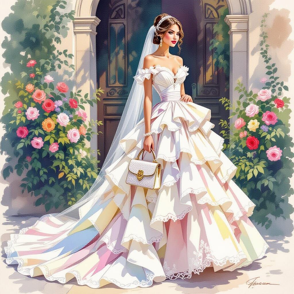 This fashion illustration showcases a vintage-inspired wedding dress with delicate ruffles, lace, and a dramatic train, rendered in soft rainbow colors with meticulous detail.
