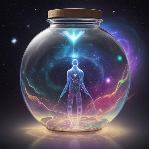 A vibrant cosmic illustration of a miniature universe contained within a glass jar. The image evokes a psychedelic aesthetic reminiscent of visionary art, rendered in stunning 8k resolution.