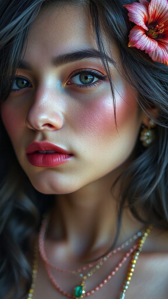 This image shows a vibrant portrait of a girl with intricate filigree details, rendered in a fauvist style characterized by bold colors and dreamlike surrealism. The lighting is soft and the image is highly detailed.