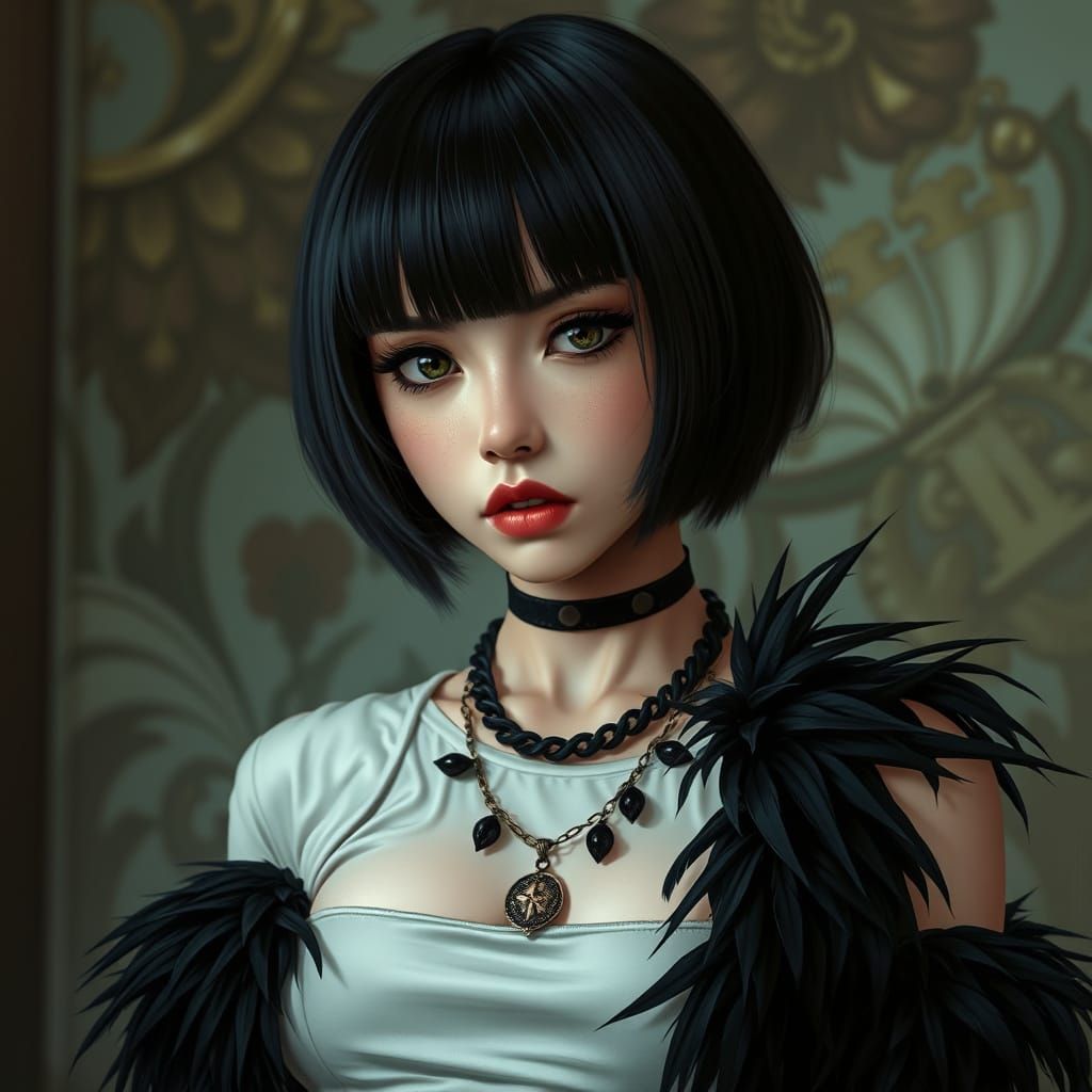 Character portrait of a young woman with bobbed hair and feather vest, in an atmospheric steampunk world. Art Nouveau, maximalist aesthetics, intricate details, opulence.