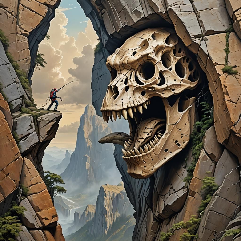 A surreal image of a massive T-Rex skull carved into a cliff face, seamlessly blending with the weathered rock. Two rock climbers are abseiling down the face in this hyperrealistic artwork.