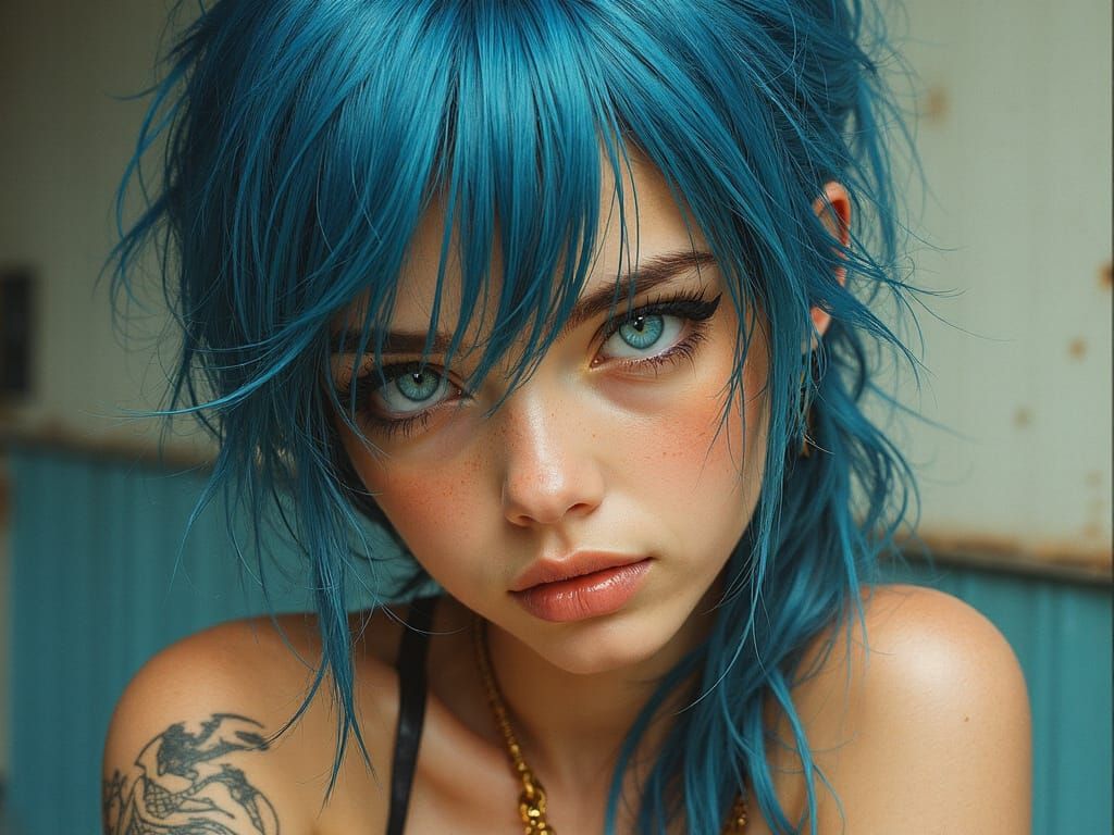 This highly detailed, realistic image features a striking individual with unique blue-grey hair, glowing neon eyes, and tattoos. The sharp focus and intricate textures highlight their provocative beauty and expressive gaze.