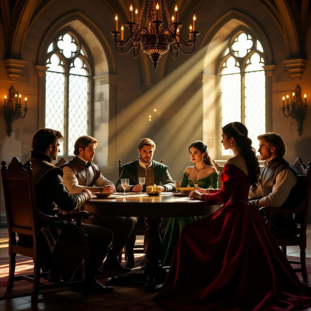 A cinematic, photorealistic scene inside a castle hall during golden hour. Light streams through windows, illuminating a feast with young men, an older man, and women in striking medieval attire.