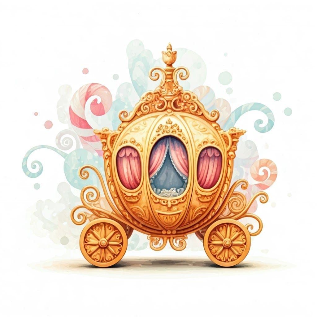 This image shows an ornate doll carriage set on a white background. The whimsical, dreamlike atmosphere evokes a sense of innocence with vibrant colors and swirling patterns in a gouache style.