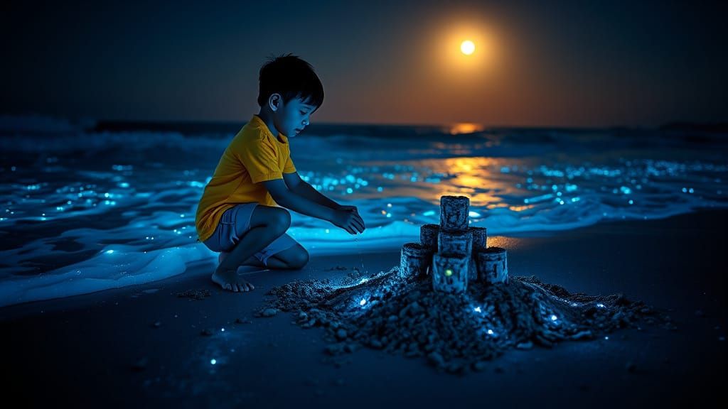 This image shows a child on a beach building a sandcastle as glowing waves wash ashore. The scene is lit by a rising moon in a retrowave style.