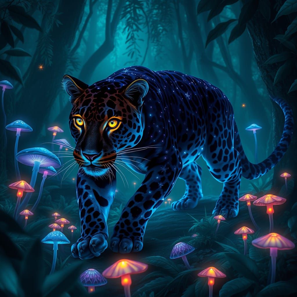 This image depicts a regal jaguar moving silently through a dense, bioluminescent rainforest, surrounded by glowing flora and iridescent mushrooms, with an otherworldly presence evoking ancient myths and mysticism.