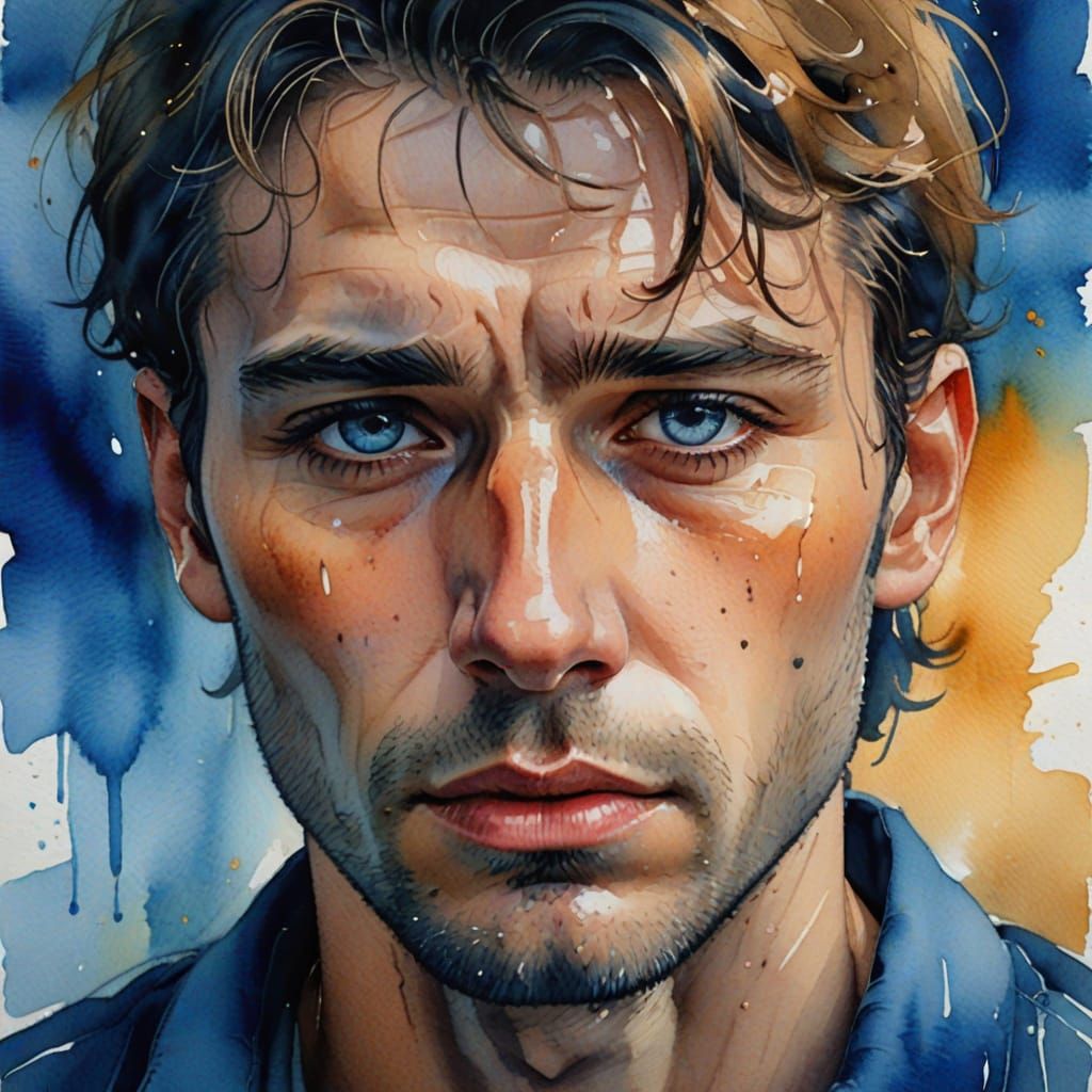 A close-up watercolor portrait of a melancholic young man with soft features and vibrant blue tears. Expressive brushstrokes and warm golden lighting create an emotive, dreamy aesthetic.